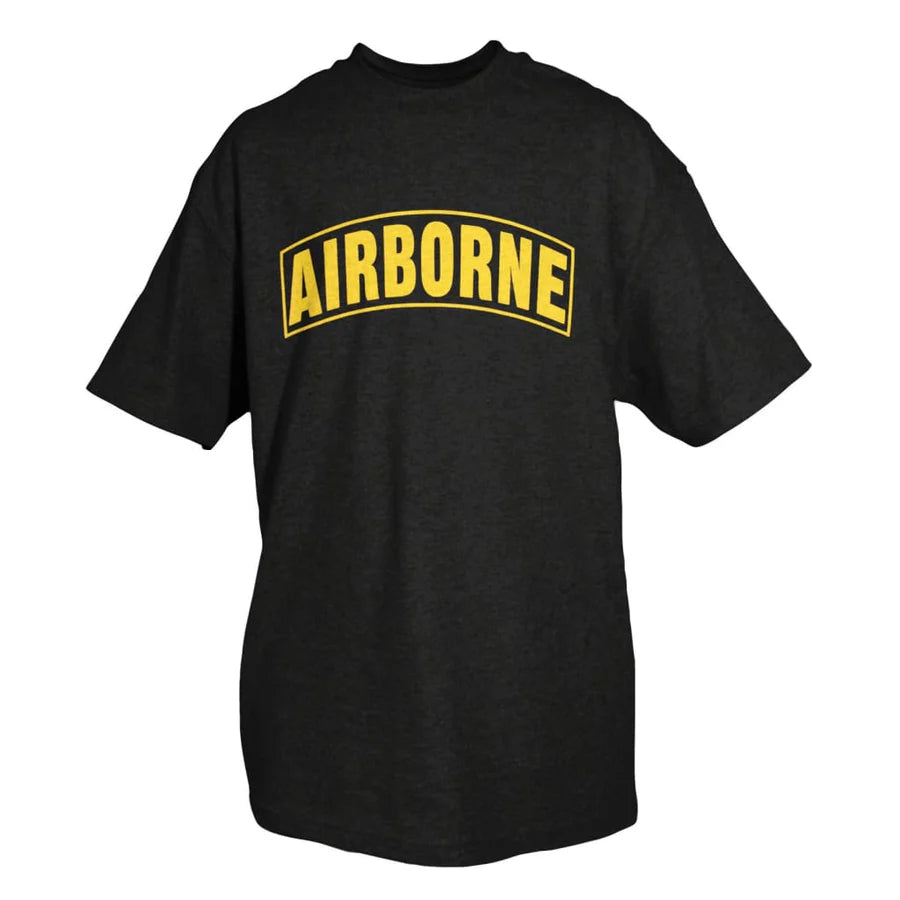 Black colored 1-sided short sleeve T-Shirt with an Airborne tab across the chest.