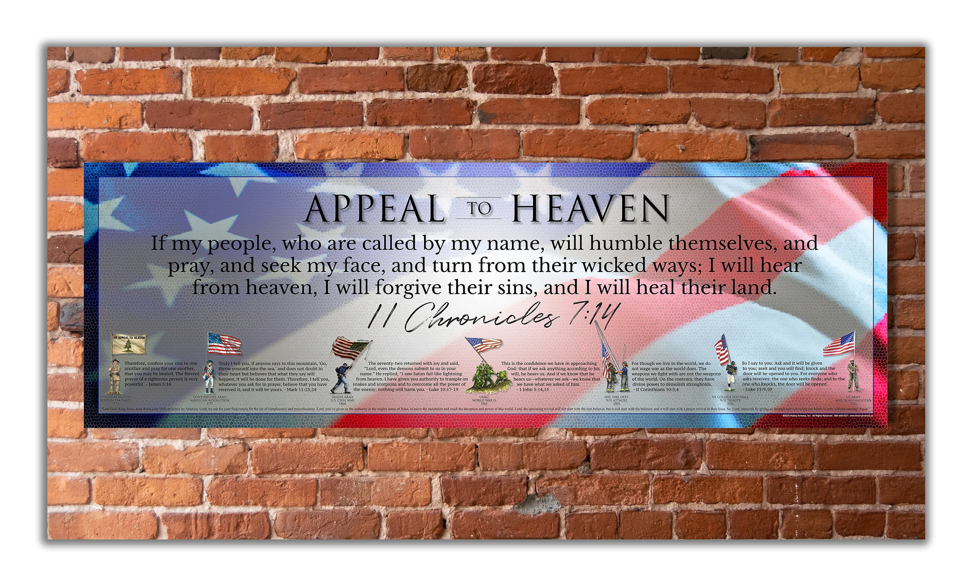 One of Americas first unofficial flags during the American Revolution was Appeal To Heaven Flag inspired from the writings of John Locke. Some of America’s earliest battles and victories (Bunker Hill and the Battle of Boston) were fought under a banner declaring “an appeal to Heaven.” Today we are once again appealing to Heaven asking for Gods grace and blessing upon America. The main text is II Chronicles 7:14 and along the bottom of the print are seven flag bearers with six popular Bible verses associated with prayer. (James 5:16, Mark 11:23, 24, Luke 10: 17-19, 1 John 5:14, 15, II Corinthians 10:3, 4 , Luke 11:9, 10).