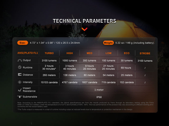 - Included: Fenix ARB-L21-5000 V2.0 5000mAh 21700 battery