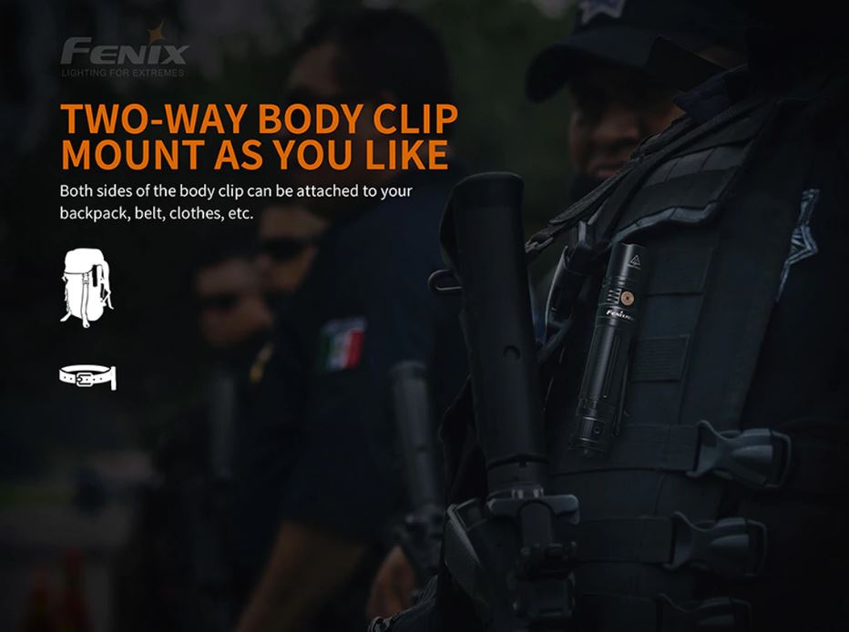 Designed for tactical and professional applications, the Fenix PD36R Tactical Flashlight has an assortment of different features, including a max output of 1600 Lumens on the turbo setting which casts a beam distance of 928 feet. In terms of size, the light is only 5.35 inches in length and 1.04 inches in diameter. Made with a high-strength aluminum, this powerful flashlight can handle the elements and a drops of 1.5 meters on all sides. To protect all that functionality, the Fenix PD36R has been IP68 waterproof rated, allowing it to withstand being underwater up to 6.5 feet for 30 minutes. A quick tap of the PD36R's rear tactical switch will instantly activate the flashlight, while a full press will leave the flashlight turned on. Do you need more power? No need to worry; Fenix has integrated an all-new ARB-L21-5000 mAh (21700) rechargeable battery with the Fenix PD36R that lasts longer than the typical 18650 battery. This new battery can be quickly charged with the included USB Type-C charging cable that plugs right into the flashlights charging port. Battery status can be seen on the flashlights side switch which lets you know when it's time to charge your torch. Carrying the Fenix PD36R is a breeze with the innovative two-way body clip that attaches to backpacks, belts, and clothes. Upon purchasing the Fenix PD36R Tactical rechargeable flashlight, you will receive a durable holster, lanyard, O-ring, battery, charging cable and user manual.
