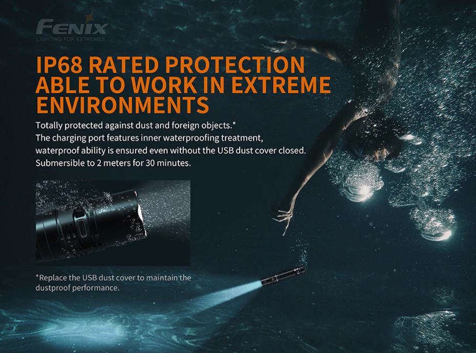 Why does the Fenix PD36R stand out from the rest of the competition? The most obvious answer is the use of the 21700 battery in this fantastic Tactical flashlight. For many years the standard for flashlight was always 18650 rechargeable lithium-ion batteries. However, there was room for improvement, and Fenix delivered with the release of the 21700 rechargeable battery. This Lithium-ion battery allows flashlights like the PD36R to have longer runtimes and reach higher lumen capacities that were not achievable with the 18650 battery. What makes this battery even better is the fact that it is only a few millimeters bigger than its predecessors the 18650. Most 21700 flashlights stay within the same size range of 18650 torches, of course, with the added lumens and longer runtimes. Please read the included user manual for safe charging practices. Only use the included cable and a non-variable AC adapter no higher than 3 amps/15 watts.