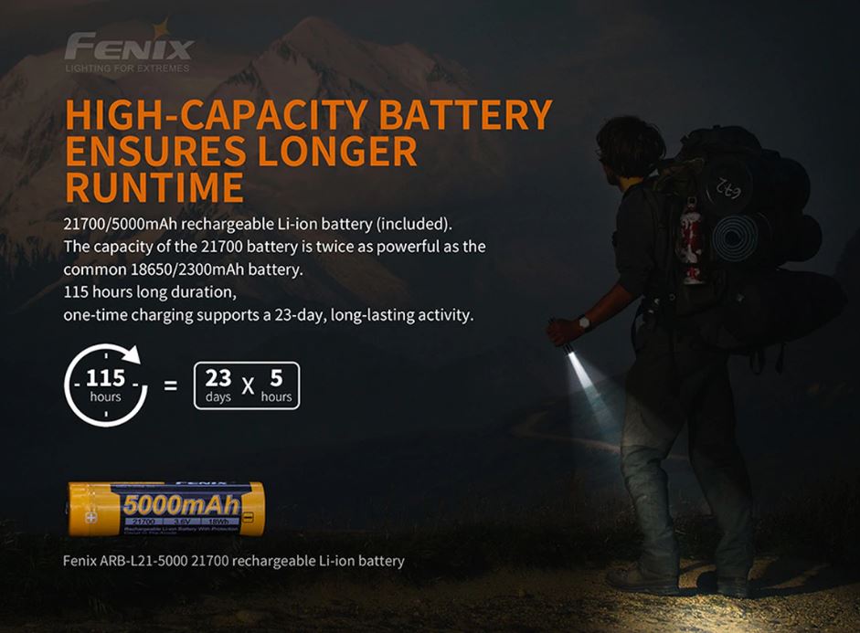 - Included: Fenix ARB-L21 5000 mAh Rechargeable Battery (21700 Size)