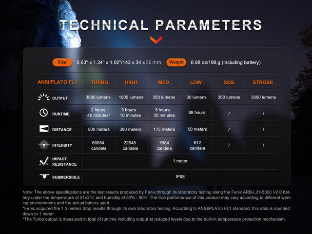 MODE OUTPUT RUNTIME Turbo 3000 lumens 2 hrs 40 mins High 1000 lumens 3 hrs 10 mins Mid 350 lumens 8 hrs 30 mins Low 30 lumens 89 hours SOS 350 lumens ~ Strobe 3000 lumens ~