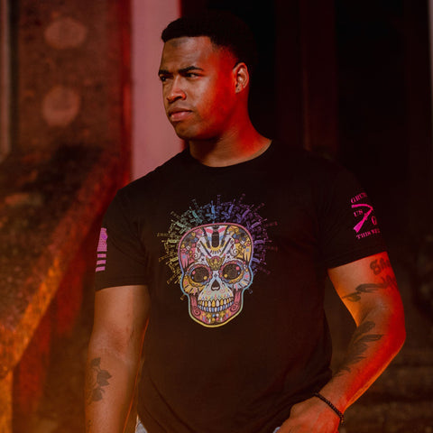 This skull is decorated with a colorful arsenal of frags, RPGs, M4’s,Uzi’s, knives, and nukes to show any onlookers that this season you're rocking a bright 2nd amendment right! So rep this Sugar Skull of Weapons graphic T-shirt with pride wherever you go by ordering yours today!