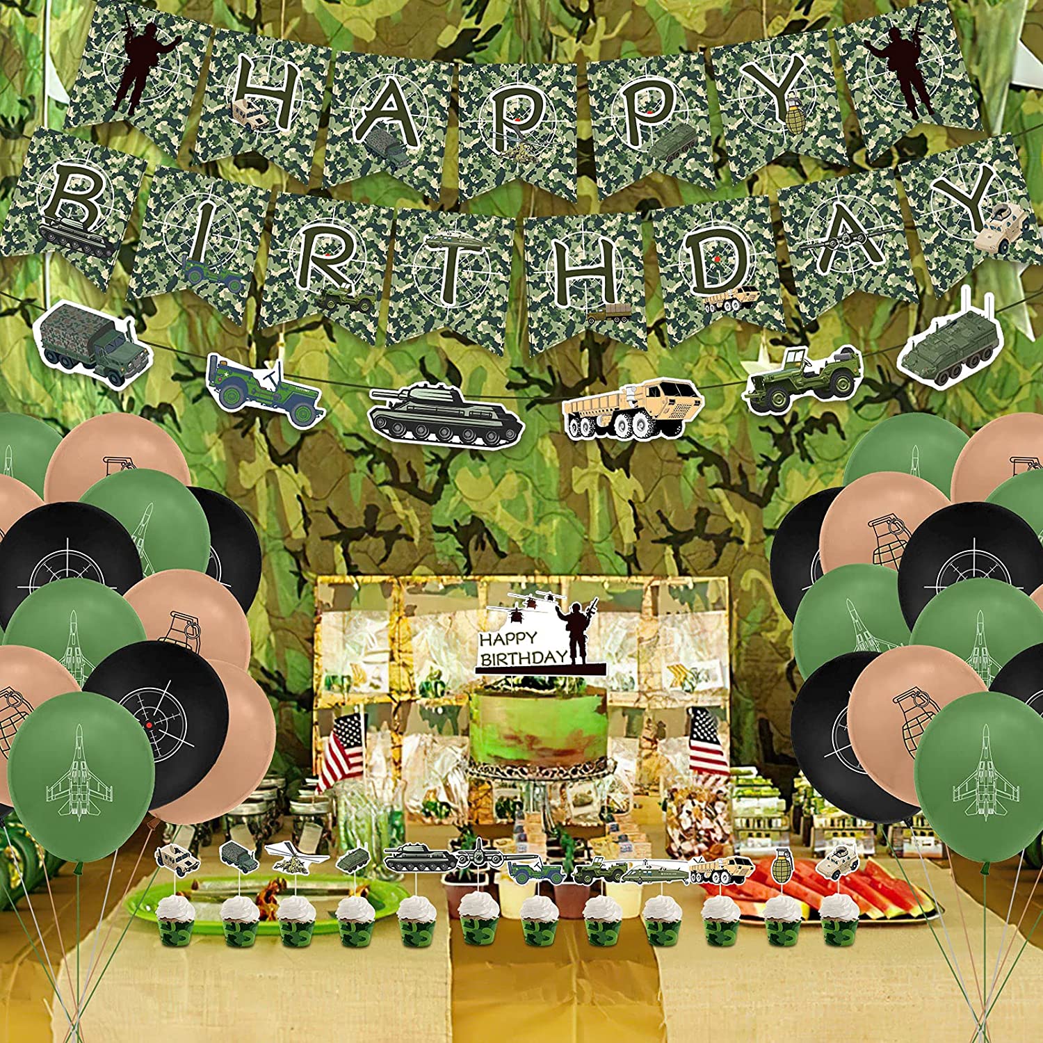 - Camouflage Decorations Party : 3 Birthday banners, 30 army design balloons, 1 Cake Topper, 12 Cupcake Toppers