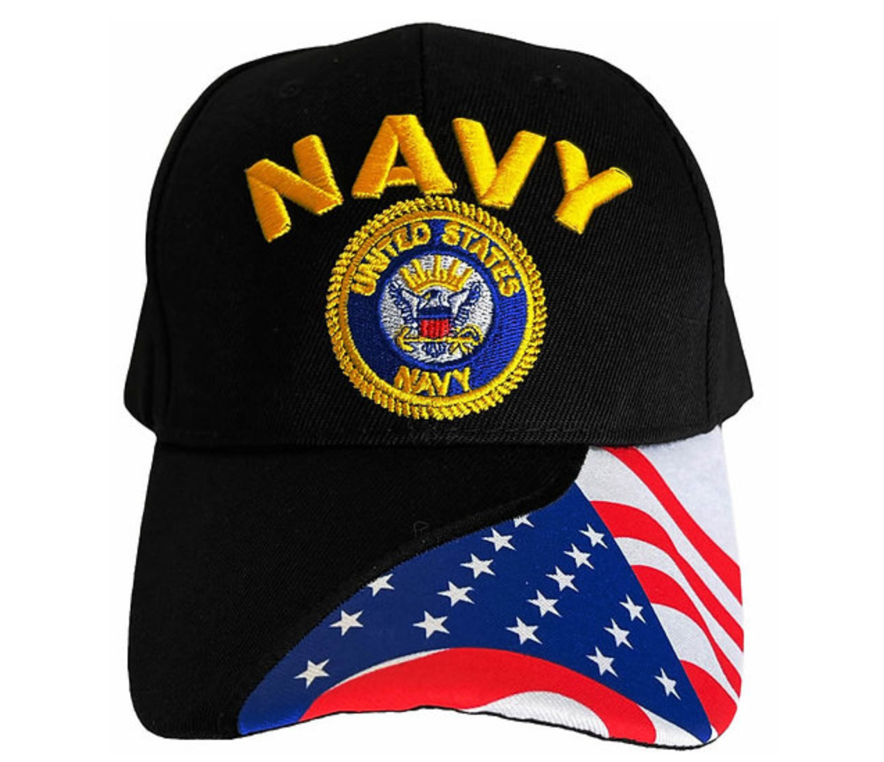 This Navy Logo cap features a striking red, white, and blue flag on the bill, adding a patriotic touch to its classic design. Crafted with expert precision and quality, this cap is the perfect accessory for any occasion. Show off your love for your country with this timeless piece.Embroidered