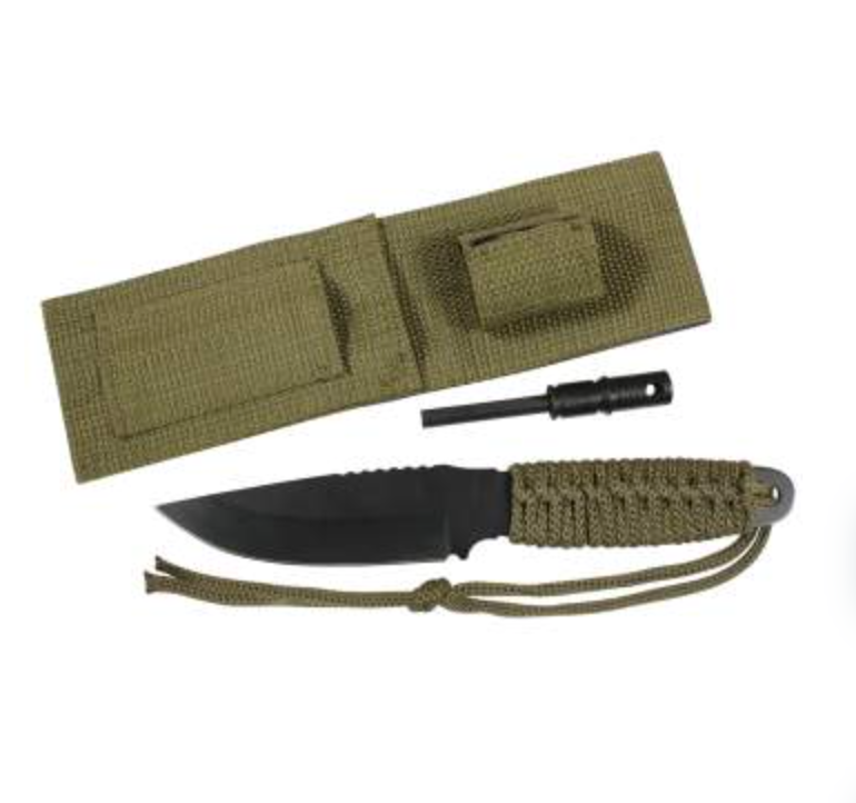 Rothco's Paracord Knife with Fire Starter is a must-have tool for any outdoor enthusiast or survivalist. Measuring 8 inches in total length, this versatile knife features a 3.5-inch black blade made from 420 stainless steel, ensuring durability and sharpness. The handle is wrapped with sturdy paracord, providing a comfortable and secure grip, while also offering an additional survival tool. The survival knife comes with a durable polyester sheath, complete with a hook & loop handle strap to keep it securely in place.