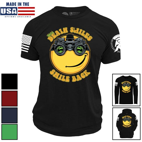 Relentless Defender Apparel design No Worries, featuring the term, “When Death Smiles, Smile Back” T-Shirt. This captivating design takes a playful twist on the iconic “Don’t Worry, Be Happy” smiley face, infusing it with an audacious smirk and equipping it with night vision goggles. With a powerful message and a bold aesthetic, this shirt will turn heads and make a statement wherever you go.