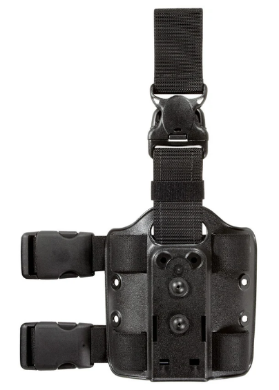 This is a Double Strap Leg Shroud featuring dual 2” (50mm) elastic leg straps and a quick-release buckle with 2” (50mm) strap that attaches to the belt. It is constructed using injection molded nylon for durability and flexibility. It features mounting holes for the attachment of three Safariland® tactical accessories or one holster with two accessories. The elastic leg straps feature two silicone for non-slip traction.
