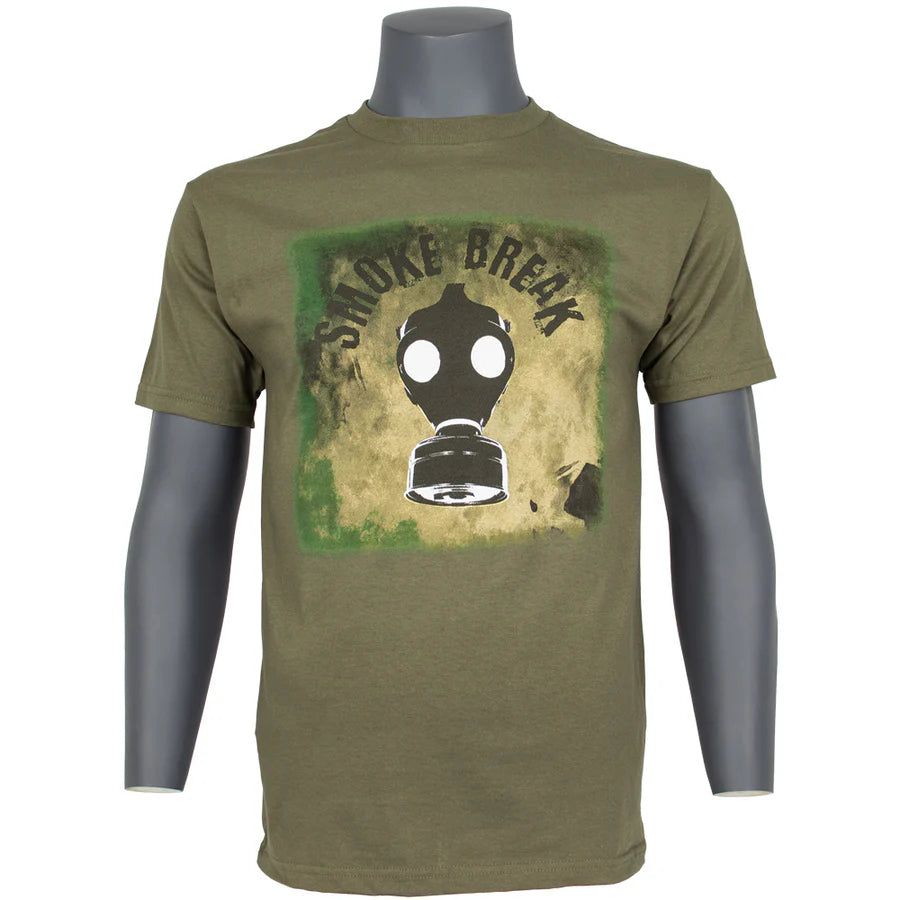 Olive Drab colored 1-sided short sleeve T-Shirt with a Gas mask / smoke break graphic across the chest.