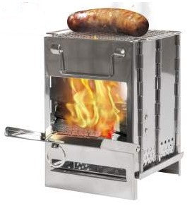 - Camping Wood Stove Consists Of Three Components: Steel Stove Base, Removable Grill Plate, And Ash Pan