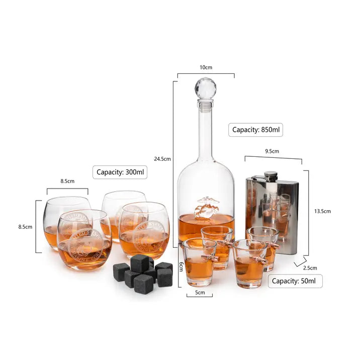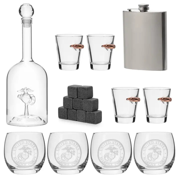 TOAST TO THE UNITED STATES MARINES: Is your marine soldier currently overseas or stationed far away? Surprise them when they come home from deployment with this respectable whisky decanter & glass set. Is your honorable vet enjoying their well-earned retirement? Help them unwind and reminisce with their platoon buddies over a glass. There’s no greater toast than, “This We’ll Defend.” STRIKING & UNIQUE GIFT: A perfect gift for veterans. This gift set comes with everything a Marine would want to unwind with, including a decanter, 4 marine glasses, 4 bullet shot glasses, and a marine flask all encased in a beautiful American Flag Mahogany wood case. Appropriate for birthdays, anniversaries, Christmas, Valentine’s Day, Father’s Day, Mother's Day, Veteran’s Day, and Independence Day celebrations.